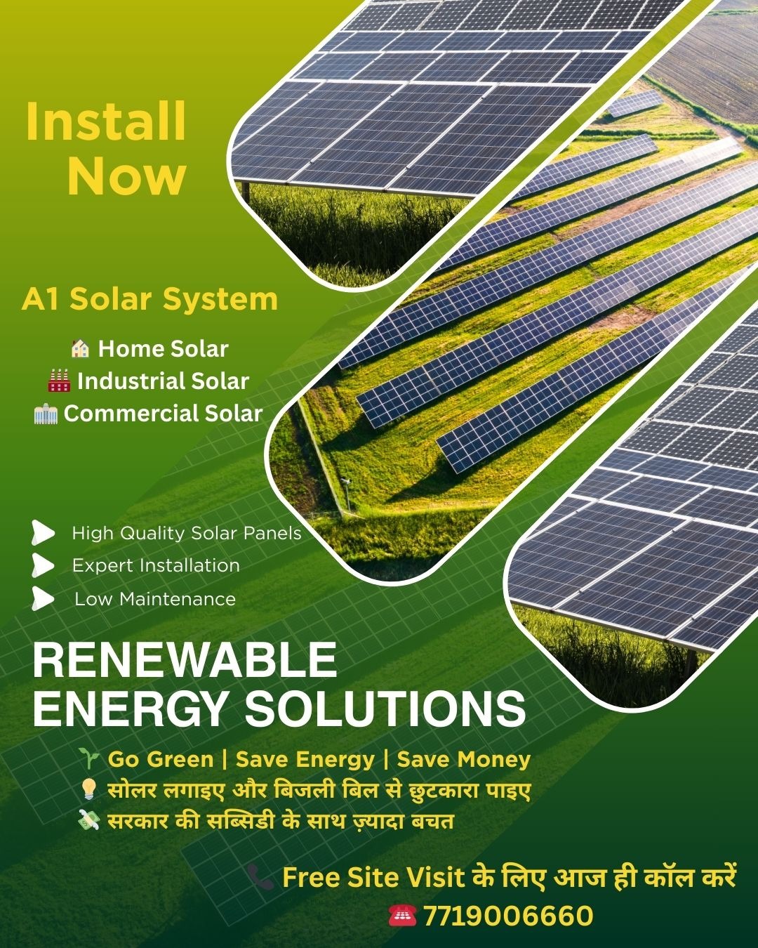 Install Rooftop Solar with ZERO DOWN PAYMENT ✔ EMI Facility Available ✔ Home & Commercial Solar ✔ Fast Installation ✔ Trusted Service ✔ 5 Years Maintenance Warranty 🏠 Home | 🏢 Shop | 🏭 Commercial Solutions Solar + FREE Gift 🎁 📲 Book your slot now – A1 Solar System 📞 Call Now: 7719006660 / 9623725110 👉 Free Site Survey Available
